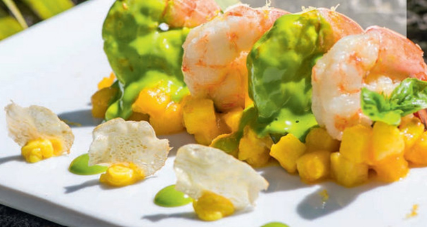 Crevettes sur curry de patate douce et ananas, purée de citron et mayonnaise au basilica