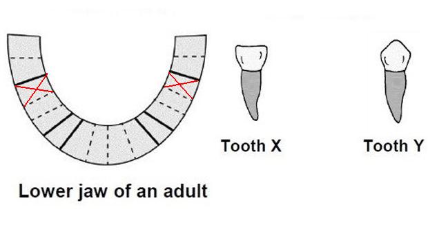 Comme on peut le voir sur le schéma ci-dessus, on compte sur cette mâchoire trois prémolaires. Les quenottes marquées d’une croix se trouvent dans la mauvaise zone : elles auraient dû être placées dans celle des molaires au lieu de celle des prémolaires.