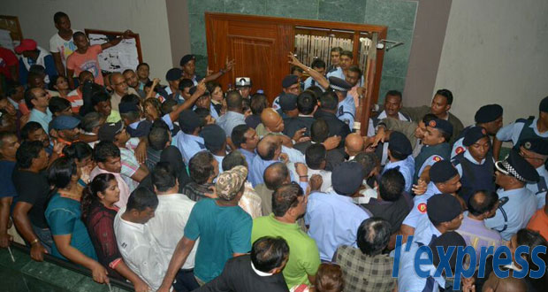 14 heures 33: La SSU tente tant bien que mal de calmer la foule. Les partisans hurlent à pleins poumons "Pravind ! Pravind !"