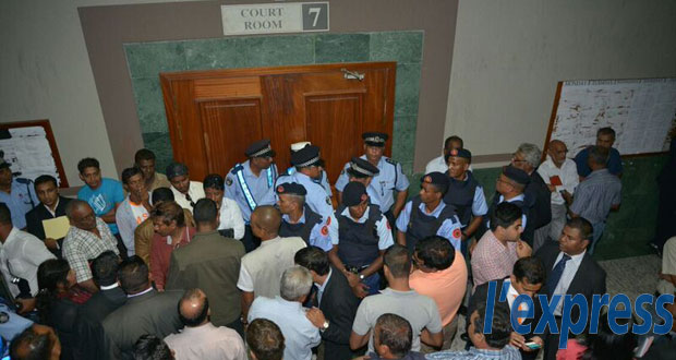 10 heures 58 : Bousculade aux abords du tribunal. Les avocats Raouf Gulbul et Rasheed Daureeawoo ont du mal à accéder à la salle d’audience.
