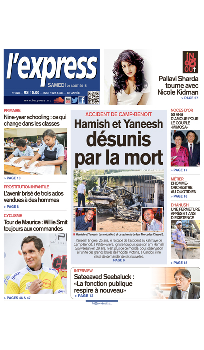 L’express consacre sa Une à l’accident spectaculaire qui a coûté la vie à Hamish Gowreesunker. Ce dernier a péri carbonisé au volant de sa voiture. Son ami, Yaneesh, qui était aussi dans le véhicule, ne sait toujours pas que son ami est mort. Il se remet de ses blessures à l’hôpital Victoria.
