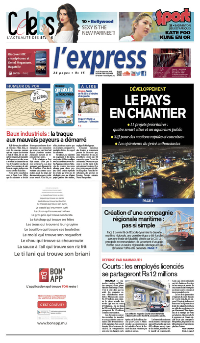 L’express consacre sa Une aux projets de développement élaborés par l’État. Un comité public-privé s’est réuni hier pour faciliter leur concrétisation. Autres titres en Une : La création d'une compagnie régionale maritime, la traque aux mauvais payeurs a démarré pour les détenteurs de baux de l’État, et les employés limogés de Courts qui se partageront la somme de Rs 12 millions.