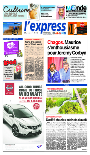 L’express consacre sa Une à la réaction des hommes politiques mauriciens à la suite de l’élection de Jeremy Corbyn à la tête du Labour britannique. Certains le considèrent comme un «ami» de Maurice qui fera avancer le dossier Chagos. Autres titres: malaise entre les cabinets d’audit et tout ce qu’il faut savoir pour obtenir la nouvelle carte d’identité.