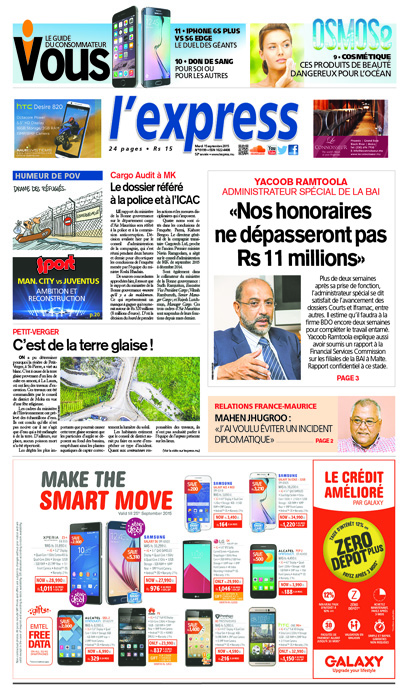 En Une de l'express de ce mardi : l'administrateur spécial de la BAI Yacoob Ramtoola revient sur ses réalisations après presque trois semaines. Sa priorité, dit-il, est la préservation des emplois. Autres titres importants: le cargo audit à MK, le clash entre Ivan Collendavelloo et le député orange Bashir Jahangeer ou encore un cas de maltraitance alléguée à Caroline avec une mère de quatre enfants arrêtée.