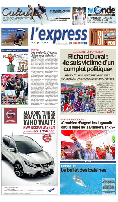L’express consacre sa Une au drame survenu à Forbach. L’ancien député du PMSD Richard Duval, dont la voiture a été retrouvée à proximité du lieu de l’accident, se rendra au CCID ce lundi. Il soutient qu’il est «victime d’un complot politique». Autres titres: Navin Ramgoolam s’en prend à la famille Jugnauth tandis que les employés d’Iframac poussent un «ouf» de soulagement.