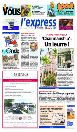 A la Une de l’express: alors que le ministre Bhadain avait promis que les salaires des Chairmen des corps parapublics seraient plafonnés à Rs 70 000, la réalité est différente… Autres titres: le Syndicat des sucres entamera bientôt des pourparlers avec ses membres autour de son existence et une cellule ministérielle a été mise en place pour retrouver les cinq Mauriciens portés disparus en Arabie saoudite.