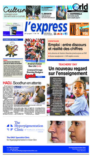 En une de l’express de ce lundi 5 octobre: un nouveau regard sur l’enseignement à l’occasion du Teachers’ Day. Autres titres: alors que le grand argentier annonce la création de 16 000 emplois pour 2015-2016, Statistics Mauritius n’en prévoit que 5 100, et Showkutally Soodhun attend toujours pour savoir s’il se déplacera ou pas en Arabie saoudite.