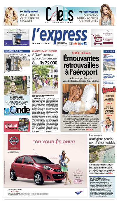 En une de l’express : Émouvantes retrouvailles  à l’aéroport après le hadj. À La Mecque, les corps de Zainobee Kaudeer et Swaley Janoo identifiés. Autres titres : Remous autour d’un déjeuner à… Rs 72 000 à l’UoM alors que les finances sont dans le rouge, l’État intraitable concernant le partenaire stratégique pour le port.