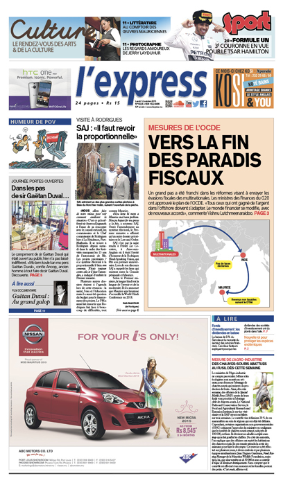 L’express consacre sa une aux mesures de l’OCDE, soit aux réformes visant à enrailler les évasions fiscales. Autres titres en une : SAJ à Rodrigues : «Il faut revoir la proportionnelle», «Journée portes ouvertes : dans les pas de sir Gaëtan Duval», «Des chauves-souris abattues au fusil dès cette semaine».