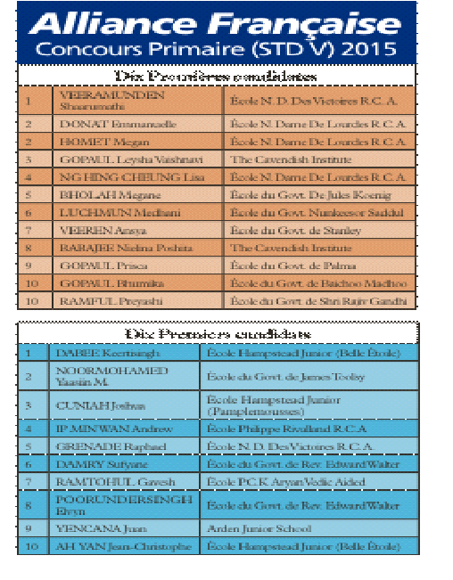 Shaarumathi Veeramunden, pour les filles, et Keertisingh Dabee, pour les garçons. Ce sont là les deux jeunes qui ont obtenu le 1er prix de supériorité à l’issue du concours de l’Alliance française (Standard V) tenu en novembre dernier. Voici la liste des dix premiers candidats et candidates.