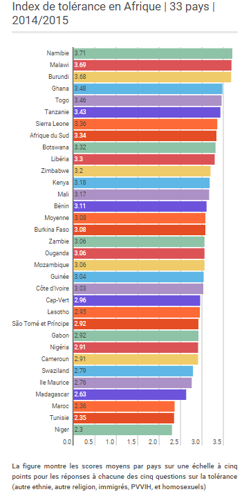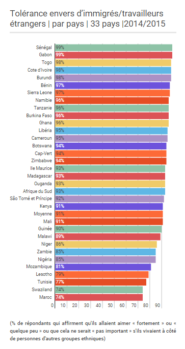 Le rapport tient compte de 33 pays africains. Intitulé «Bons Voisins ? Les Africains démontrent un sens élevé de la tolérance envers beaucoup, mais pas tous», il couvre la période 2014-2015.