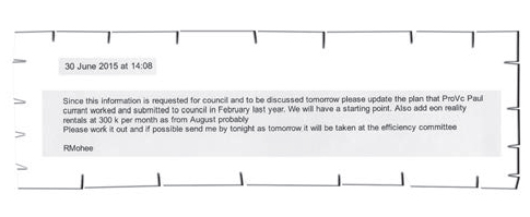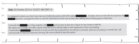 En fait, même si Romeela Mohee n’a pas siégé sur le Budget and Infrastructure Committee (BIC) de l’UoM lorsque l’item EON Reality a été discuté, elle a quand même fait suivre des mails en mai et en juin de la même année sur ce sujet. D’ailleurs, en mai 2015, un mail envoyé du bureau de la VC fait mention d’une rencontre entre les différents partenaires à la Council and Senate Room.