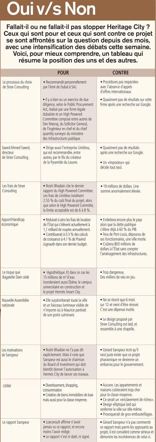 Le topo d’abord. Vendredi après-midi, après des délibérations au Conseil des ministres, il a été décidé que le projet Heritage City serait gelé. Au centre de la polémique, un bras de fer opposant le conseiller spécial du ministre des Finances, Gérard Sanspeur, et le ministre de la Bonne gouvernance. Mais aussi le rapport des finances qui «décrédibilise» le projet, avec un «focus» sur Bagatelle Dam.
