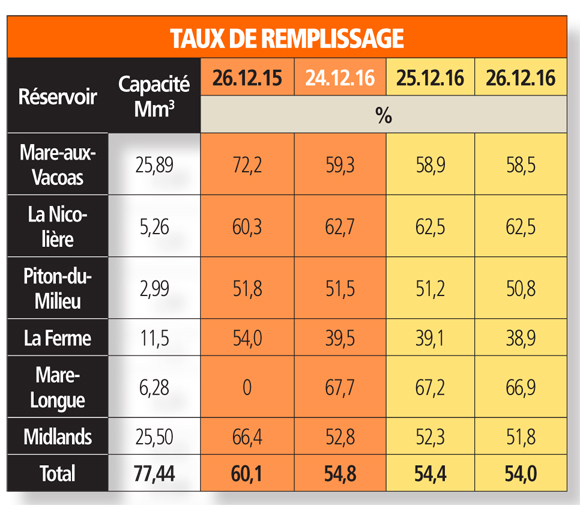 Le différentiel en ce qui concerne la quantité d’eau traitée au quotidien fait également sourciller les autorités. À la station de traitement de Pailles, l’on compte 22 000 m3 d’eau de moins que ce que l’on traite d’habitude par jour. Cette station rend potable au moins 80 000 m3 d’eau au quotidien, alors que ces dernières semaines, uniquement 58 000 m3 d’eau sont traités. Pour Port-Louis en entier, le manque en eau par jour tourne autour de 38 500 m3, soit 106 500 m3 à traiter au lieu de 144 500 m3. Ce scénario peut être étendu dans toutes les régions du pays.