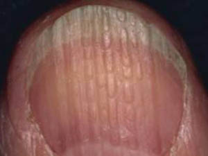 Les lignes blanches parallèles qui s’étalent sur l’ongle sont connues comme les lignes de Muehrcke. Elles révèlent notamment un faible taux de protéines ou de zinc dans l’organisme. Ces lignes indiquent que la croissance de l'ongle dans ces zones a été interrompue et qu'il n'a pas reçu tous les nutriments ou le sang dont il avait besoin.