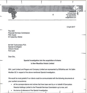 Kriti Taukoordass, Special Investigator nommé par la Financial Services Commission (FSC) pour enquêter sur les transactions boursières sur New Mauritius Hotels (NMH) a commencé son travail. Dans le cadre de cette enquête, des documents ont été soumis au nom d’ENL Land et Rogers dans une lettre adressée hier à la FSC et au Registrar of Companies, ainsi que des preliminary submissions and statement of facts de Salim Moollan, Queen’s Counsel, instruit par le cabinet ENSafrica, au Special Investigator.