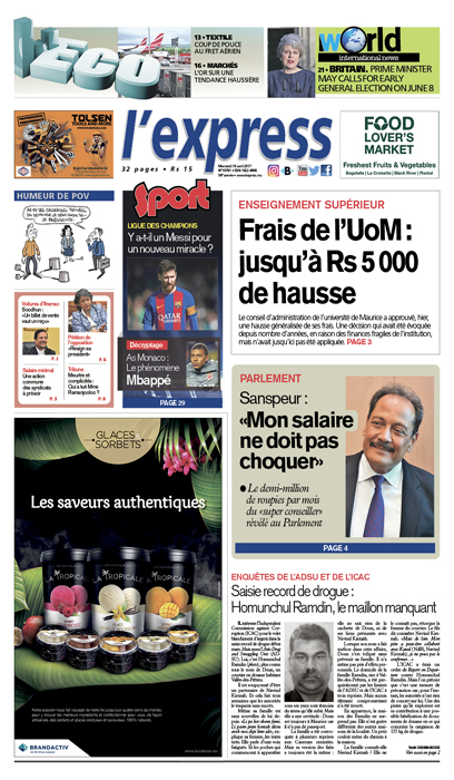 En une: jusqu’à Rs 5 000 de hausse pour les frais de l’université de Maurice. Autre titre: «Mon salaire ne doit pas choquer», dit Gérard Sanspeur.