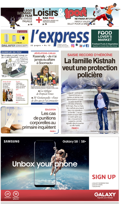 En une de l’express, la famille Kistnah veut une protection policière. Autres titres : les cas de punitions corporelles au primaire inquiètent ou encore «Je n'ai jamais eu affaire à Soornack», dit Kasenally.