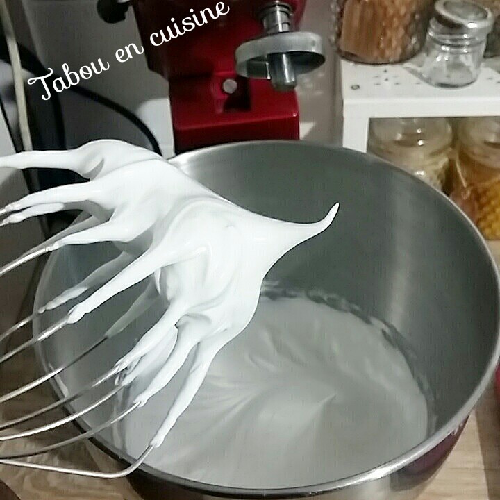 - Montez les blancs d'oeufs en neige, dès qu'ils commencent à mousser ajouter le sucre et continuer à battre.