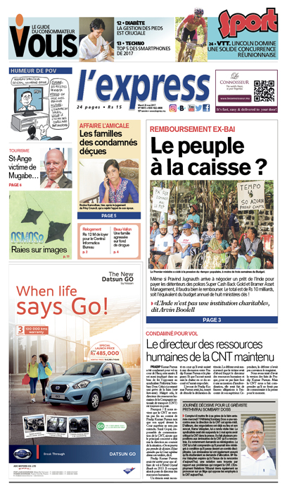 En une: Dettes de Rs 10 milliards dans l’affaire BAI: le contribuable devra-t-il rembourser ? Autre titre: condamné pour vol, le directeur des ressources humaines de la CNT maintenu.