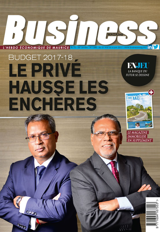 En marge de la présentation de la loi de finances 2017-18, Business Magazine donne la parole à Raj Makoond, directeur de Business Mauritius, et Raju Jaddoo, secrétaire général de la Chambre de Commerce et d’Industrie, pour mieux cerner les attentes du secteur privé. Les deux hommes s’attendent à ce que le gouvernement prenne des mesures audacieuses pour relancer la machinerie économique. Si Raj Makoond insiste sur la nécessité de réformes structurelles et sectorielles outre un partenariat plus énergique entre le secteur public et le monde des affaires, par contre, Raju Jaddoo se prononce en faveur d’une fiscalité plus légère pour les entreprises, ajoutant qu’en tant que pays visant le statut d’économie à haut revenu, il est impératif que Maurice trouve de nouveaux secteurs qui lui permettront de créer davantage de richesse. L’édition de ce mercredi est accompagnée du bimestriel Immobilier & Construction qui met l’accent, entre autres, sur le nouveau morcellement Beau Vallon, qui comprend trois quartiers résidentiels sécurisés. De quoi dormir sur ses deux oreilles !