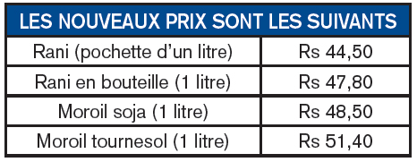 Selon Jérôme Clarenc, Marketing Manager chez Moroil Oil Refineries Ltd, cette baisse de prix est due à la conjoncture internationale : la réduction des prix du soja, du tournesol et du dollar. «Chez Moroil, nous avons la politique de répercuter toutes les conditions favorables sur le prix pour que les consommateurs puissent en bénéficier», a déclaré Jérôme Clarenc. La poche de l’huile Rani devrait donc passer de Rs 46,75 à Rs 44,50.