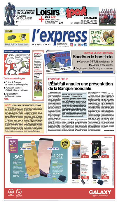 En une de l’express : Économie bleue – l’État fait annuler une présentation de la Banque mondiale. Autres titres : Menaces de mort contre Duval, Soodhun le hors-la-loi. Ou encore des houles de trois mètres attendues ce soir.