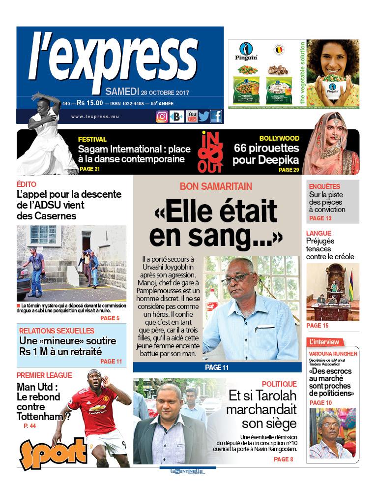 En une : «Elle était en sang.» Autres titres : «Des escrocs au marché sont proches de politiciens» et une «mineure» soutire Rs 1 M à un retraité.
