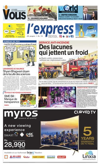 En une : des lacunes qui jettent un froid sur le service anti-incendie. Autres titres : le décor est planté pour Porlwi by nature et Shyam Bhagwant doyen de la faculté des sciences de l’UoM.
