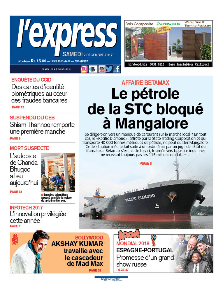 En une : le pétrole de la STC bloqué à Mangalore. Autres titres : des cartes d’identité biométriques au cœur des fraudes bancaires et l’autopsie de Chanda Bhugoo a lieu aujourd’hui.