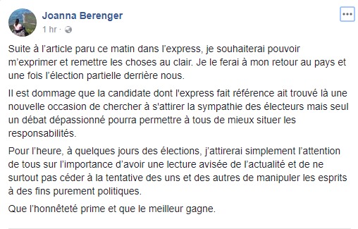 N’étant pas au pays pour le moment, Joanna Bérenger n’a pas souhaité s’expliquer davantage sur la question. «Je le ferai à mon retour au pays et une fois l’élection partielle derrière nous», a-t-elle indiqué.
