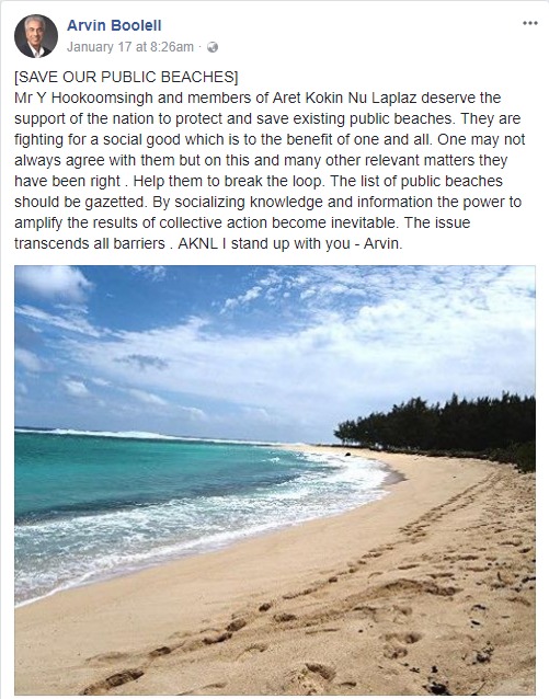 Il propose dans la foulée que la liste des plages publiques soit rendue publique. «By socializing knowledge and information the power to amplify the results of collective action become inevitable. The issue transcends all barriers», insiste Arvin Boolell.