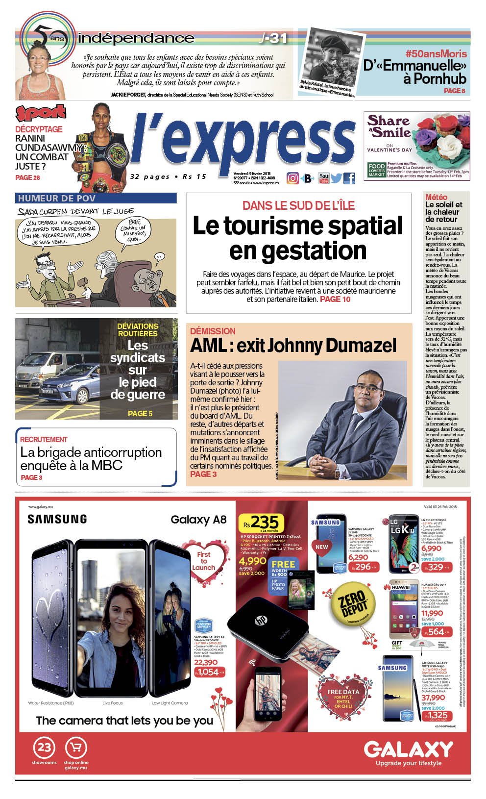 En une : Tourisme spatial en gestation. Autres titres : Dumazel n’est plus le président du board d’AML et la brigade anticorruption enquête à la MBC