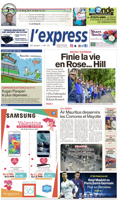 En une : Finie la vie en Rose... Hill. Autres titres : Air Mauritius desservira les Comores et Mayotte et 1 221 Mauriciens dans le service de santé britannique