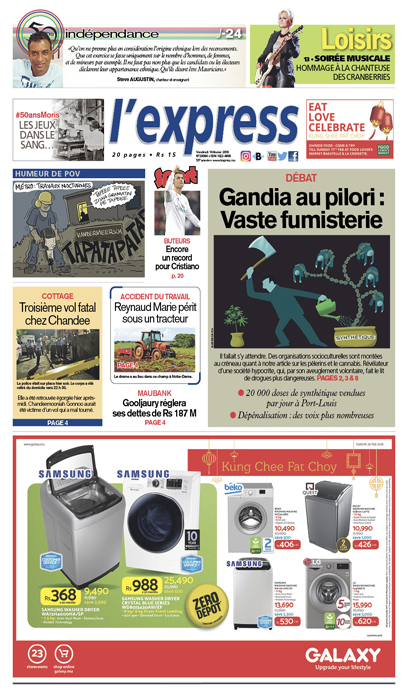 En une : Gandia au pilori : Vaste fumisterie. Autres titres : Troisième vol fatal chez Chandee et Gooljaury réglera ses dettes de Rs 187 M.