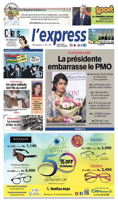 En une : la présidente embarrasse le PMO. Autres titres : un père taillade son fils au canif et «les appareils à Maurice étaient-ils en panne», se demande Aline Peltier.