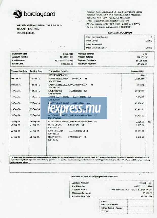 Fac-similé des comptes de la «Platinum Card» de la présidente pour septembre à décembre 2016 by L'express Maurice on Scribd