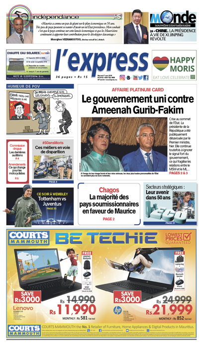 En une : Le gouvernement uni contre Ameenah Gurib-Fakim. Autres titres : la majorité des pays soumissionnaires en faveur de Maurice dans le dossier Chagos et #50ansMoris : ces métiers en voie de disparition.
