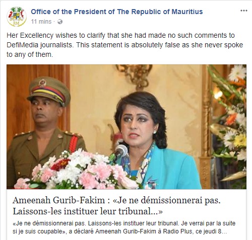 Tout ce que l’on sait pour l’heure, c’est qu’Ameenah Gurib Fakim a également eu une rencontre avec Pravind Jugnauth. Peu avant 23 heures ce soir, la page Facebook de la présidence affichait ce post : «Her excellency wishes to clarify that she had made no such comments to DefiMedia journalists. This statement is absolutely false as she never spoke to any of them.»