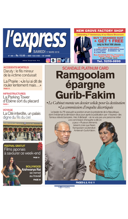 À la une: Ramgoolam épargne Gurib-Fakim dans le scandale Platinum Card. Autre titre: la Cité interdite, un palais digne du fils du ciel. Scandale Platinum Card : Ramgoolam épargne Gurib-Fakim