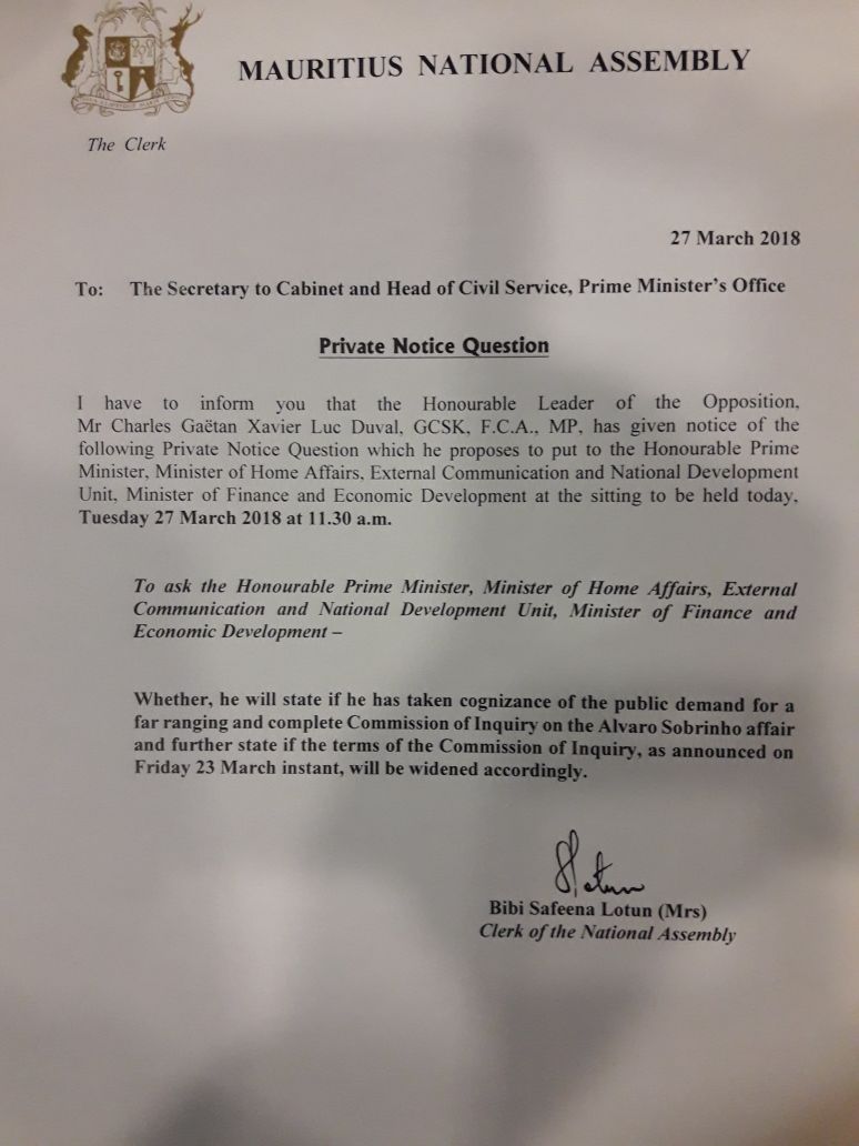 Le leader de l'opposition veut notamment savoir si le Premier ministre est conscient de la demande générale émanant de la population pour une commission d’enquête complète sur l’affaire Alvaro plutôt qu’uniquement sur les coulisses ayant mené à l’annonce de l’ex-présidente sur l’institution de la commission Moollan. En ce sens, il compte aussi demander au PM si ce dernier compte élargir les attributions de cette commission.