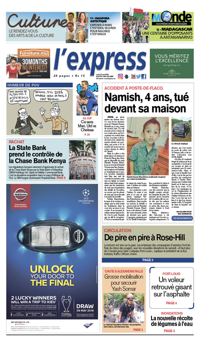 À la une – accident à Poste-de-Flacq: Namish, 4 ans, tué devant sa maison. Autre titre: la State Bank prend le contrôle de la Chase Bank Kenya.