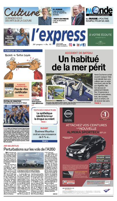 À la une : un habitué de la mer périt lors d’un accident de bateau. Autre titre : perturbations sur les vols de l’A350 d’Air Mauritius.