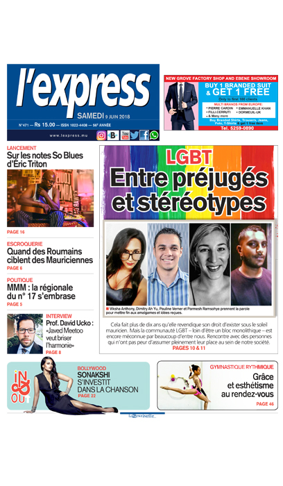 En une de l’express – LGBT: entre préjugés et stéréotypes. Autres titres – escroquerie: quand les Roumains ciblent des Mauriciennes.