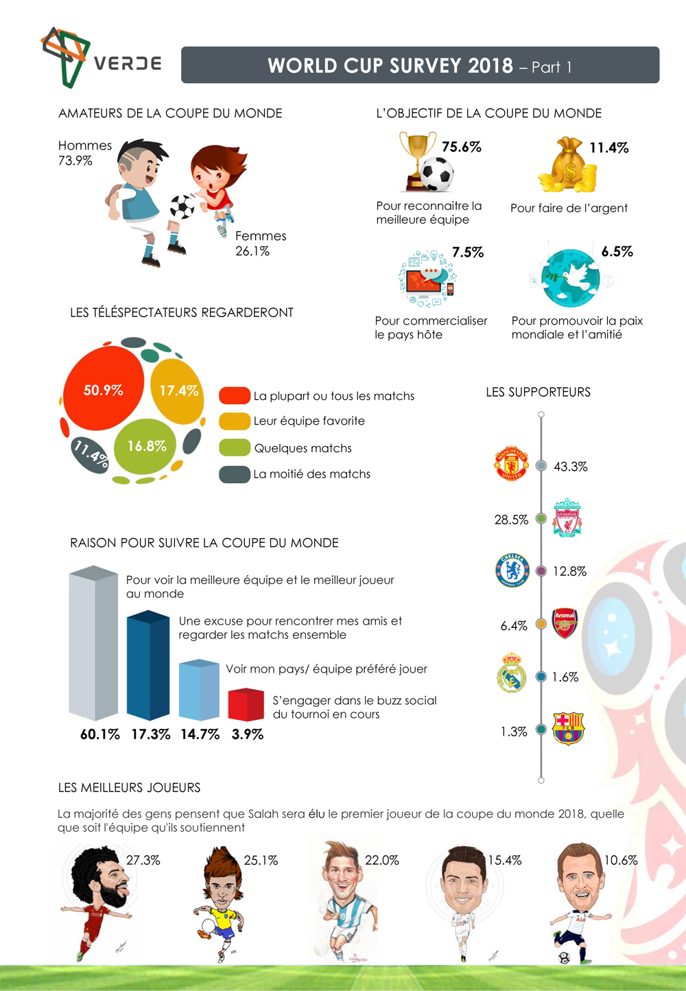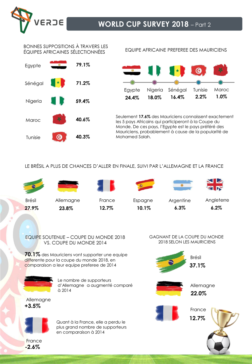 Dirish K. Noonaram, Co-fondateur de VERDE, nous parle de l’étude : «Nous avons noté que la fièvre de la Coupe du monde est forte à Maurice, l’événement favorisant l’unité et l’échange. Les données qu’on a obtenues nous ont permis de mieux comprendre le point de vue des supporteurs Mauriciens envers la Coupe du monde 2018. Cette étude est une première à Maurice et a fourni un certain nombre d’éléments clés en termes de ‘fan base’, de comportement et de préférences.»