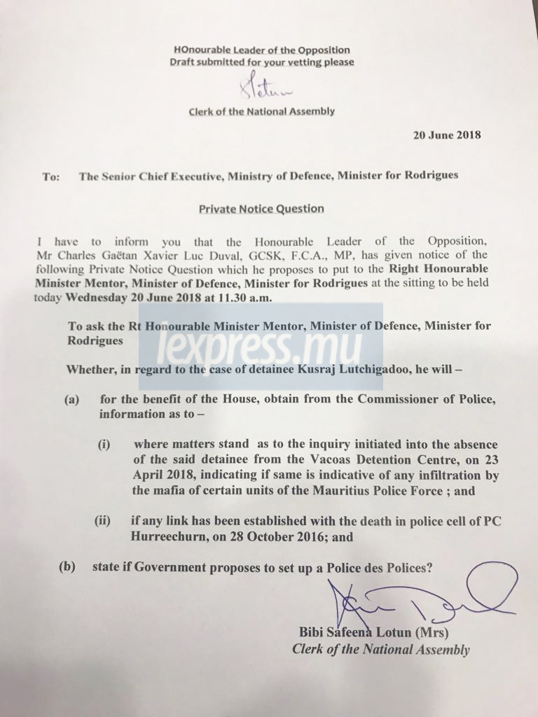 Xavier-Luc Duval veut notamment connaître si l’enquête sur l’escapade de Kusraj Lutchigadoo du centre de détention de Vacoas, le 23 avril, a avancé. Il souhaite aussi savoir si un lien a été établi avec le policier Arvind Hurreechurn, retrouvé mort dans sa cellule, au centre de détention de Moka, dans la nuit du 29 octobre 2016.