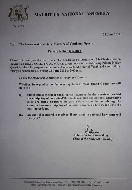 Troisième Private Notice Question (PNQ) de la semaine. Le leader de l’opposition s’intéresse, ce vendredi 22 juin, à la 10e édition des Jeux des îles. Et plus précisément au complexe multisport de Côte-d’Or, projet cher au Premier ministre. Le ministre de la Jeunesse et des sports, Stephan Toussaint, sera appelé à répondre.