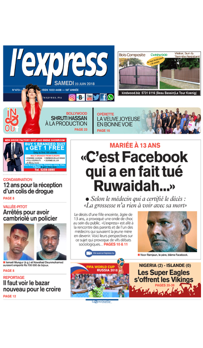 En une de l’express: mariée à 13 ans - «C’est Facebook qui a en fait tué Ruwaidah...» Autres titres: 12 ans de prison pour la réception d’un colis de drogue ou encore arrêtés pour avoir cambriolé un policier.
