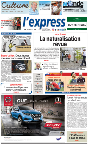 En une : Procédure : La naturalisation revue – Beau-Vallon : Deux jeunes meurent dans un accident – Personnel navigant : Turkish Airlines recrute des Mauriciens .\