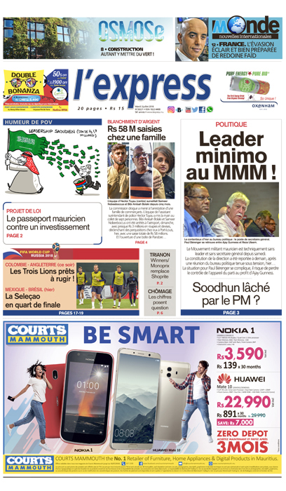 En une : Politique : Leader minimo au MMM – Transfert de bail : Soodhun lâché par le Premier ministre ? – Blanchiment d’argent : Rs 58 millions saisies chez une famille